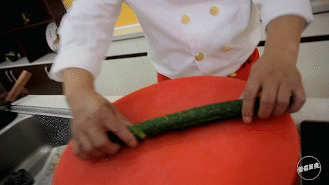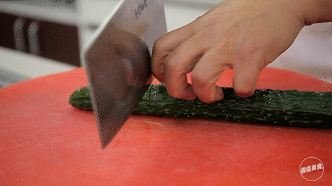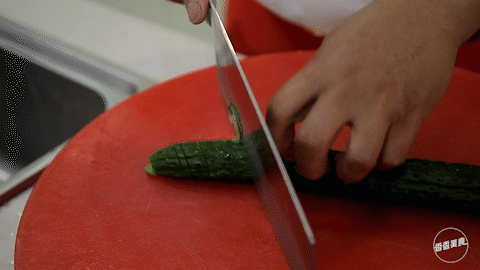小编碎碎念:新手在改刀时会手滑,可以将黄瓜表面片一刀,就能找到一个平面更容易切。如果怕把握不住力度将黄瓜切透。可以在黄瓜两侧各放一根筷子,切到筷子时就抬刀。不信,你试试?