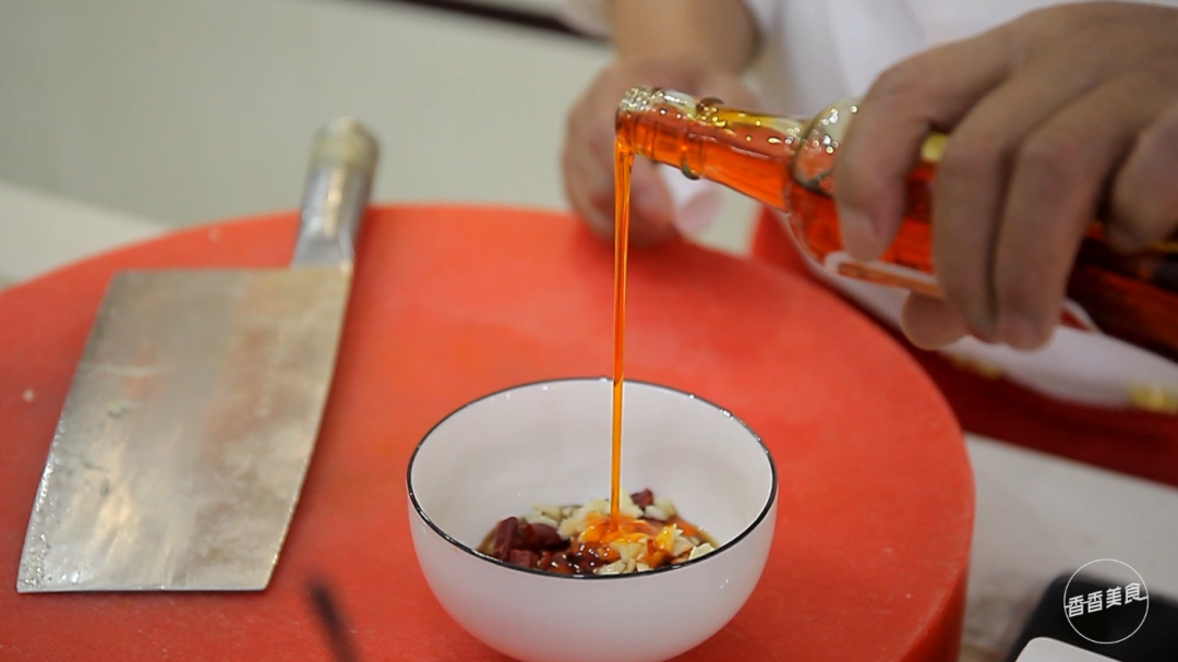 激油。 激油是调料出味的关键,油烧到七成热,直接倒入碗里,香味一下子就出来了。