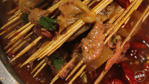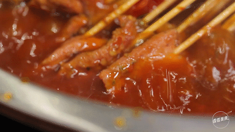 这么一大把串串,往里面一放,就显得锅稍微有点小。串串在红油里咕咕嘟嘟煮着,粉粉嫩嫩的肉片迅速打卷。不蘸料只吃原味的,中等辣度锅底已经很辣了,如果不能吃辣的话选择要慎重。能尝出牛肉品质不错,牛肉纤维摩擦牙齿很舒服,和泡椒一起嚼也多了几分滋味。