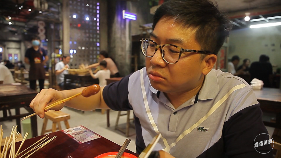 我们在串串区也发现了攀成钢一绝的同款,只是这个没有经过油炸。一个小香肠用三根签子串着,算下来差不多2块钱,比炸的要便宜一些。至于味道,两个都差不多,只是油炸的会更香一些。