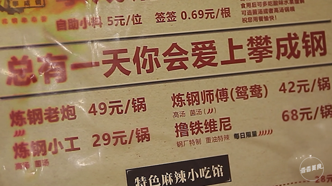 这家店的菜单很有意思,特别含蓄。炼钢老炮49元/锅、炼钢师傅42元/锅、炼钢小工29元/锅、撸铁维尼68元/锅……第一次看未免让人感觉云里雾里,这到底是啥?仔细看看下面的小字,高汤、菌汤、重油特辣……估计你心里已经明白了,这原来是锅底。
