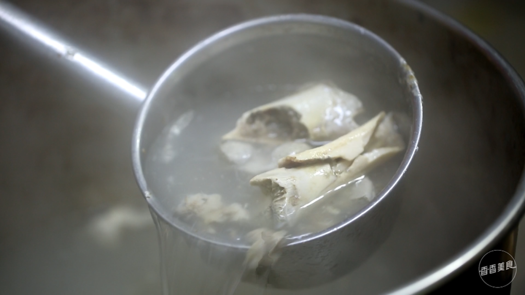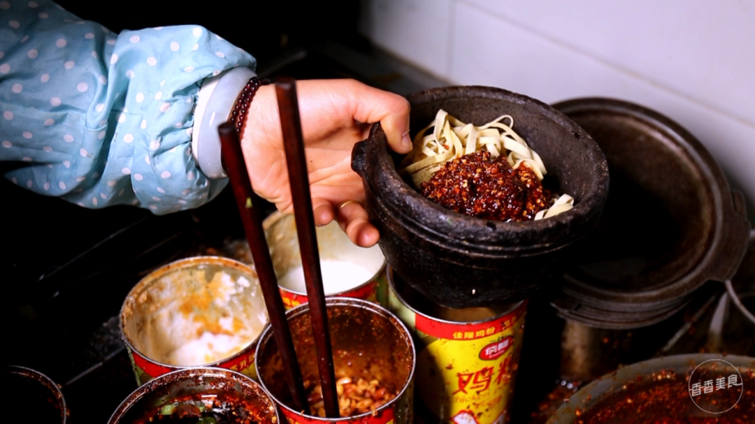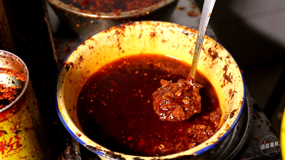 为了调节口感,每份米线里还会加入一大勺肉酱。这也是大姐自己炒的,红彤彤的看着就过瘾。再冲入大骨头熬成的高汤,这么多种味道混合在一起,让人充满了期待。