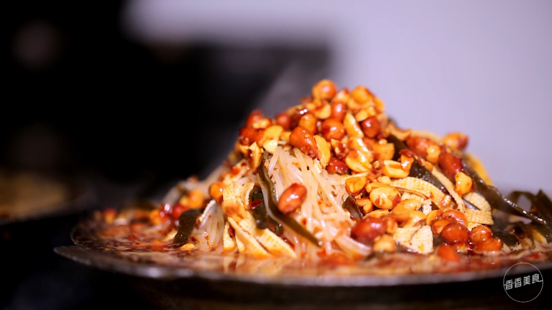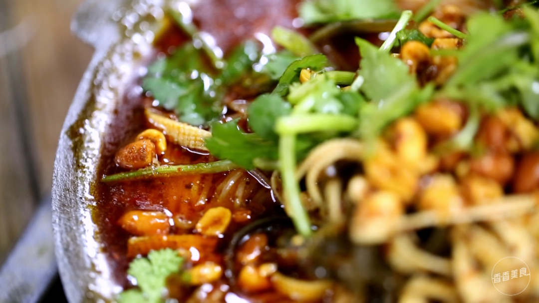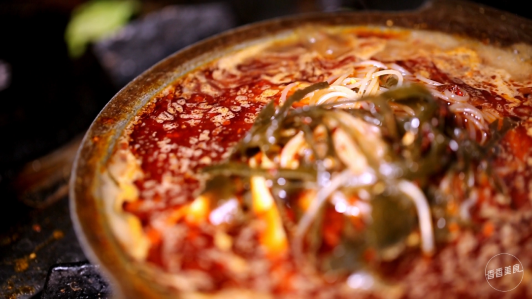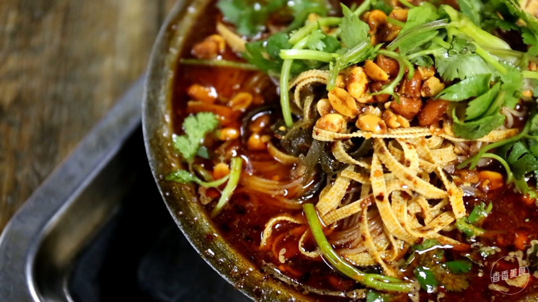 滚烫的老砂锅一上,让大家的心情瞬间嗨起来。表面撒着花生碎和香菜,料很足。汤面上浮着厚厚一层红油,看着就辣。