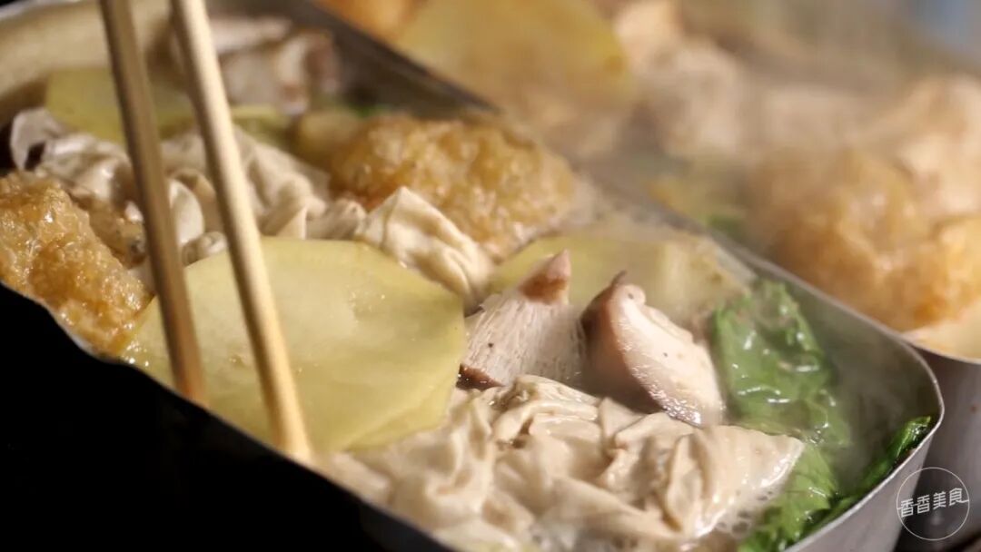 现在的饭盒泡皮可以选择 香辣和原味两种口味 ,小小的一盒,搭配的食材有青菜、土豆、蘑菇等 十二种 。泡皮在汤里炖煮后,吸收了骨汤的香浓,吃起来软糯可口,和想象中吃小火锅的口感不一样。