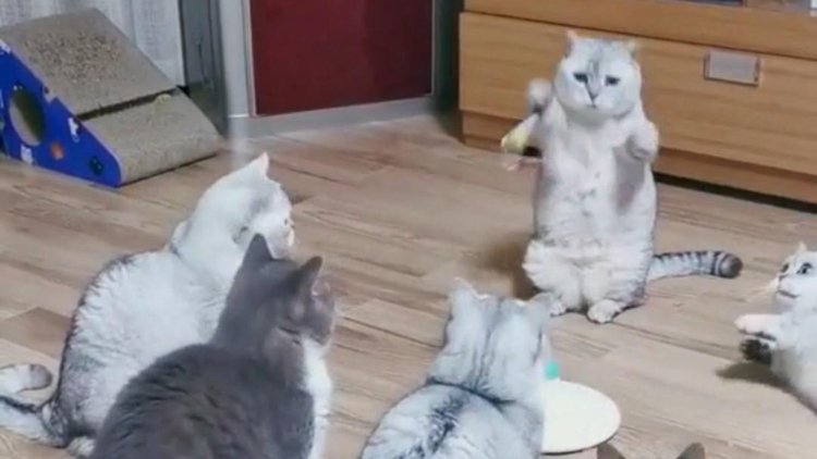猫咪围成一圈玩玩具,矮脚猫急得站起来却还是抢不到