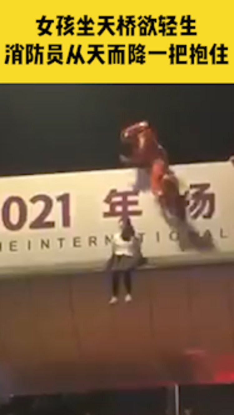 女孩坐在天桥上欲轻生,消防员从天而降将其一把抱