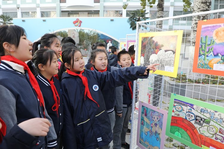 (河南省实验小学五(10)班学生在班主任连粉莉的组织下,有序参观校园书画展)