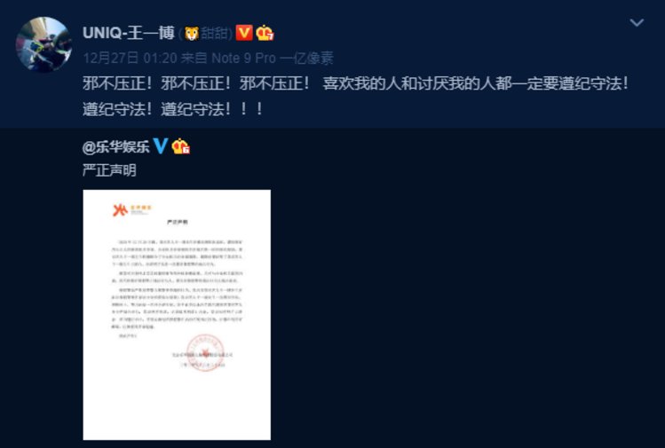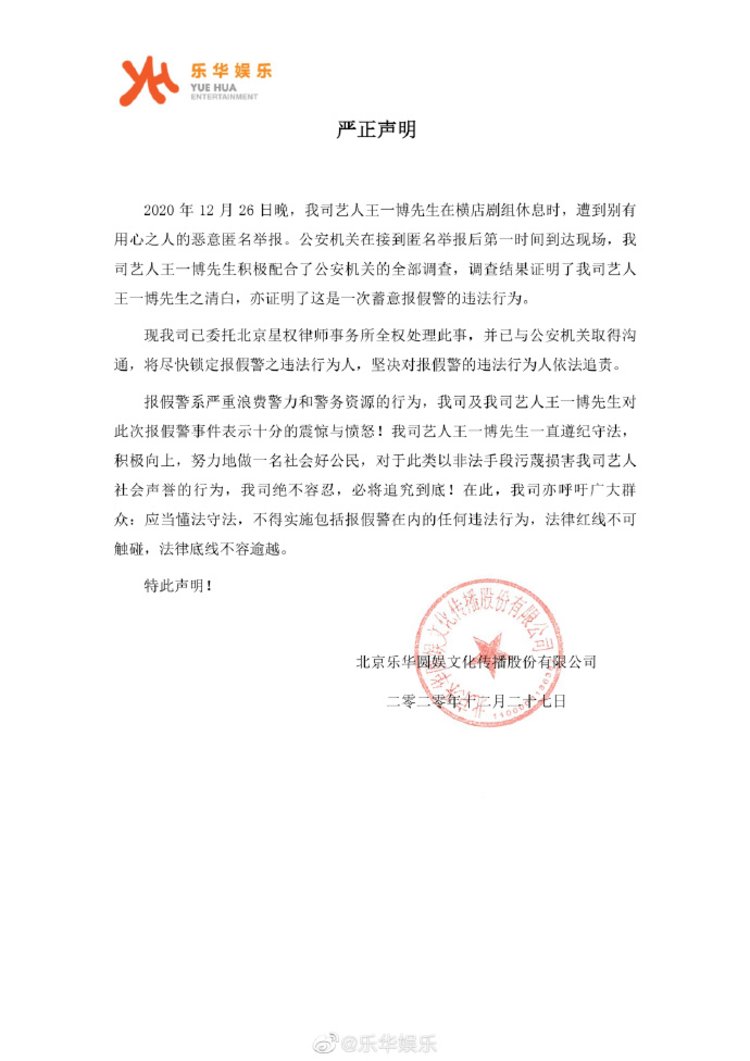 12月27日凌晨,乐华娱乐在官方微博上发表严正声明,透露王一博在横店剧组休息时遭到恶意匿名举报。公安机关接到匿名举报后第一时间到达现场,王一博配合公安机关调查,最终证明了王一博的清白,并证明了这是一次蓄意报假警的行为。