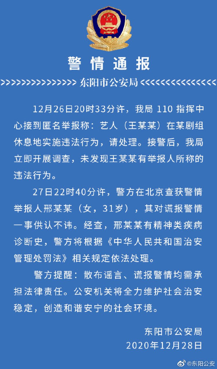 12月28日,浙江省东阳市公安局就“王一博被报假警”一事发布警情通报。称警情举报人系一女子,其对谎报警情一事供认不讳。经查,其有精神类疾病诊断史,警方将根据相关规定依法处理。