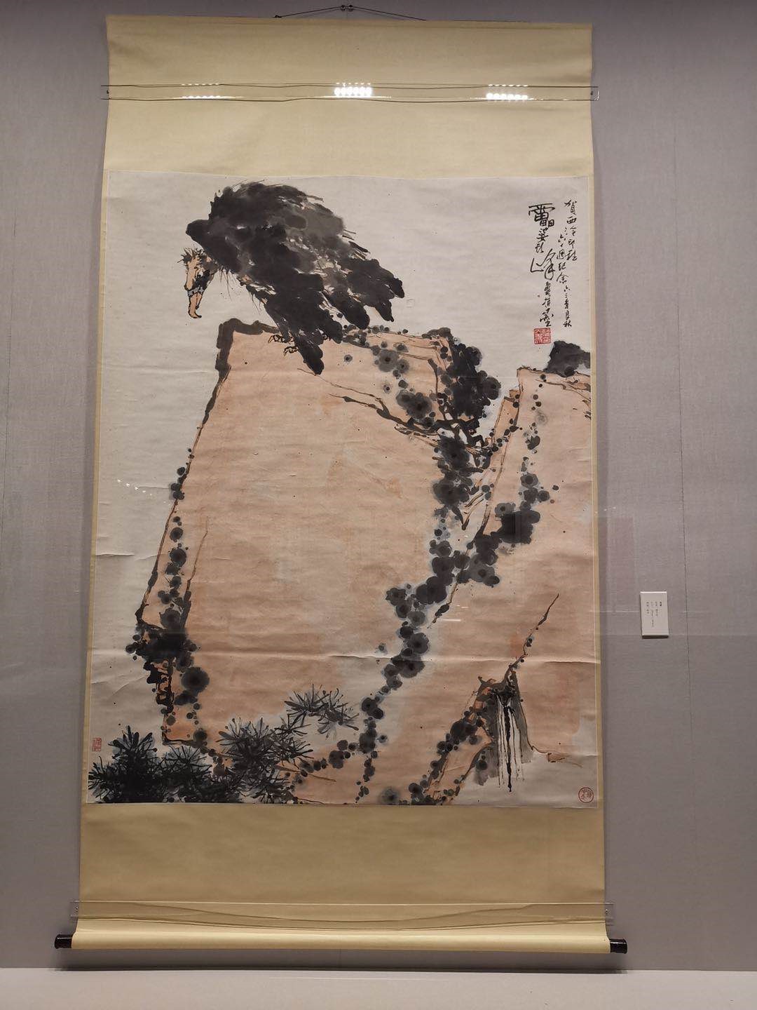 这幅画出自现代著名画家潘天寿,全画以手指蘸墨作画,秃鹫雄踞于方硬巨石之上,目光炯炯、神态威猛,给人以孤傲雄伟之势。郑州美术馆公共教育部工作人员任鑫介绍说,这幅画作可谓是整个展区最难得的“镇馆之宝”。“咱们经常见到的绘画,它的绘画主体会占特别大的面积,但是像潘天寿的这幅《秃鹫》,它的石头占的比例非常大,这也是他绘画中的一个特色,后人把他画的石头称为潘公石。他用墨用色非常大胆,下笔很有力,力透纸背的感觉。”